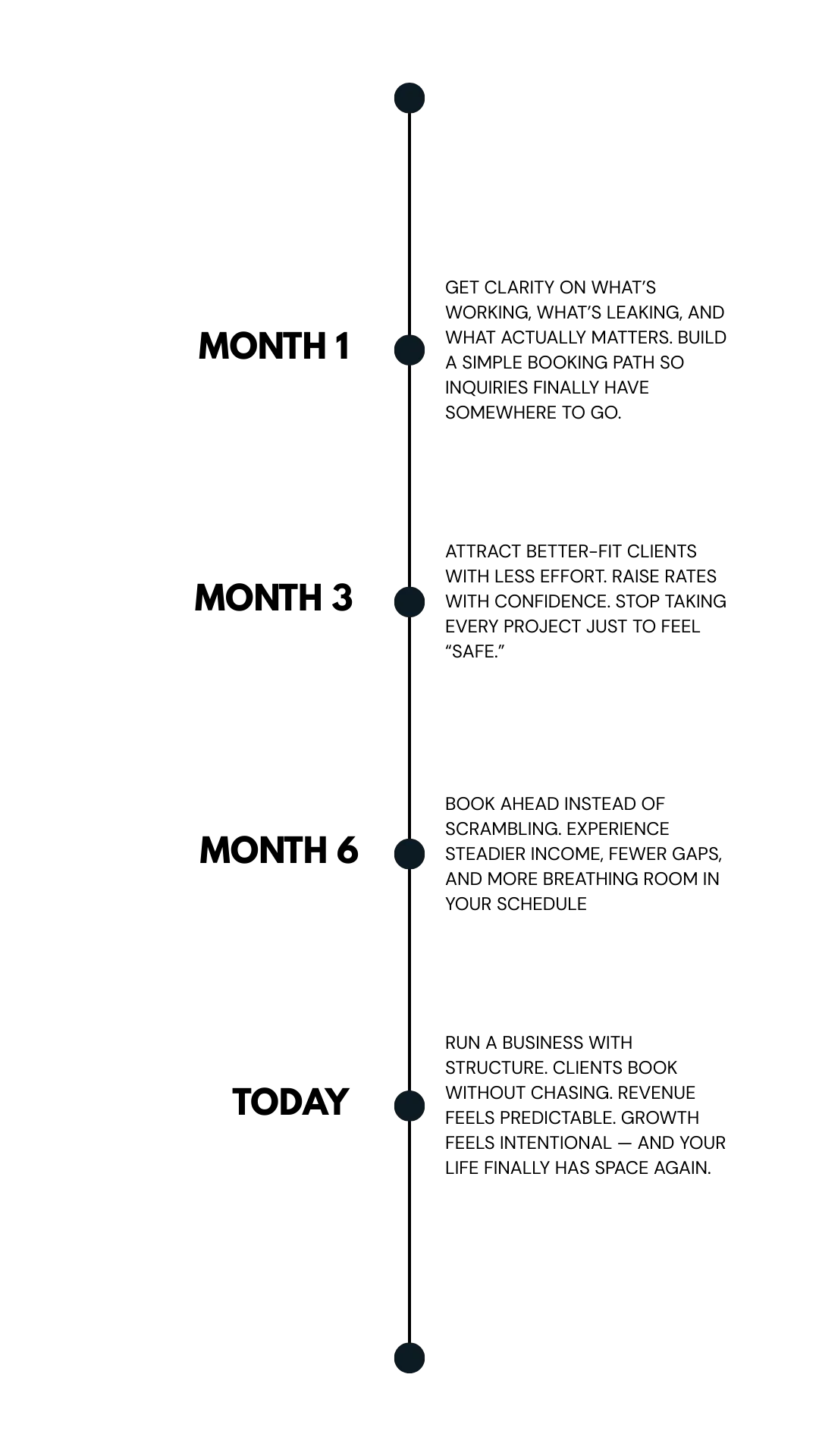 With systems and steady demand behind you, you refine your offers, raise your rates, and create room to grow — without burning out or starting over. Your income becomes more stable, your clients more aligned, and your business easier to scale.