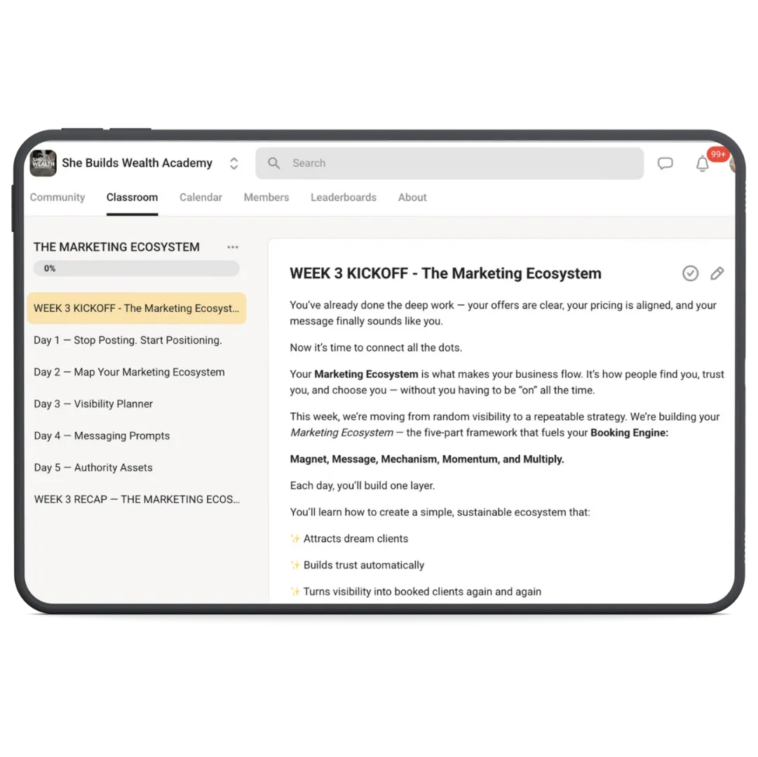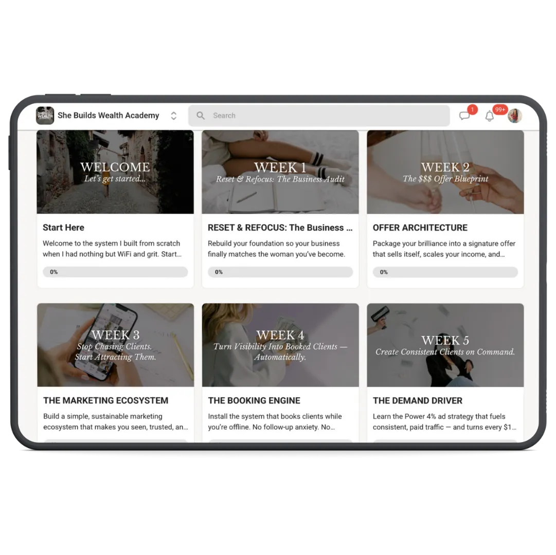 Now I’ve turned that entire process into She Builds Wealth Academy, so you can learn how to create digital marketing ecosystems and booking systems as a freelancer — without agency experience, trial-and-error, or years of guessing.