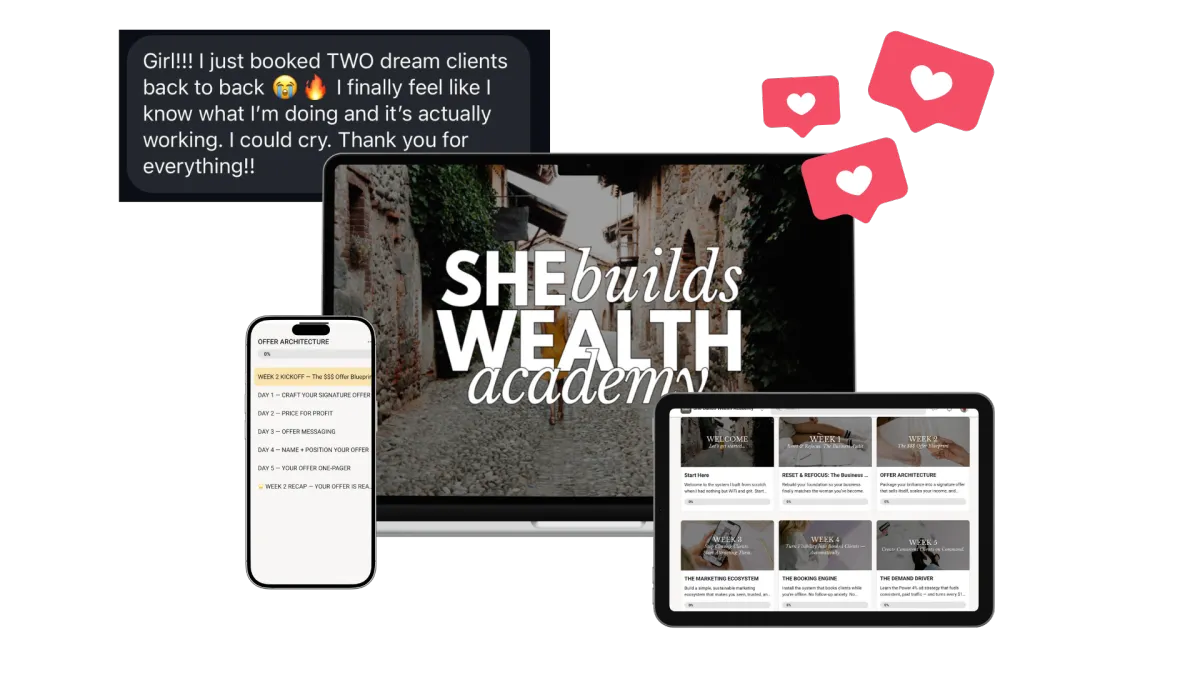 After you enroll, you’ll be taken straight into the She Builds Wealth Academy Course + Community, where you can access your lessons, tools, and support and begin building your digital-marketing skill right away.